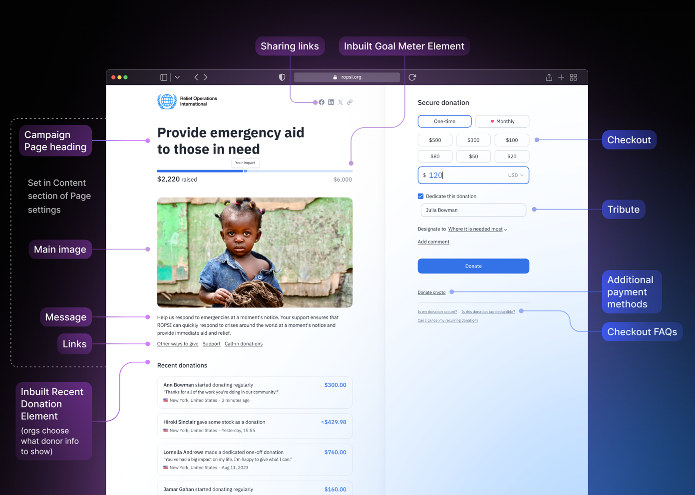 - Exceptional Supporter Experience: Campaign Pages have a sleek design focused on tools that build relationships, with ample space for text, images, and other content to craft a narrative that resonates with your audience.
