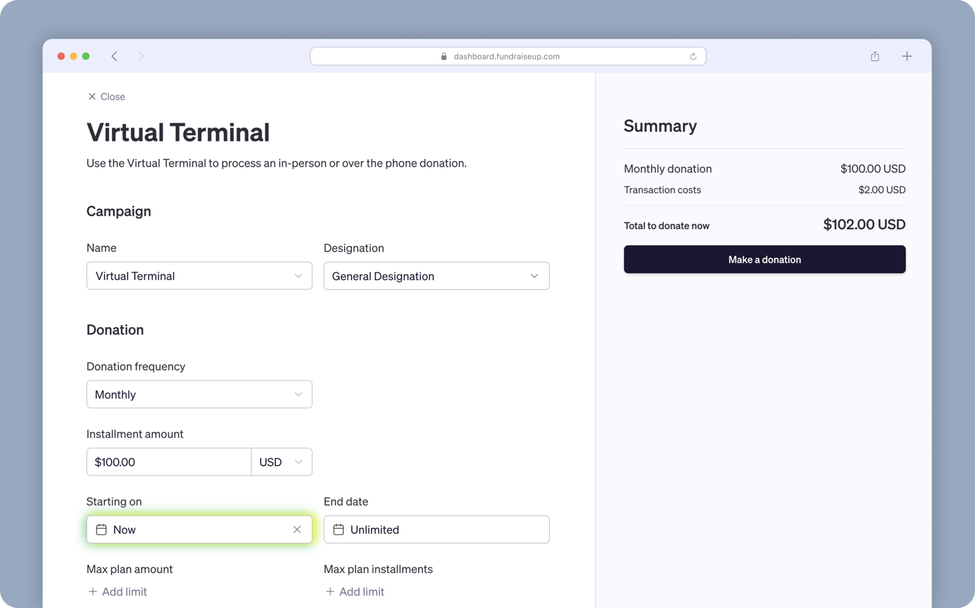 Before creating a recurring donation with a future start date, ensure that your Fundraise Up account has Virtual Terminal enabled.