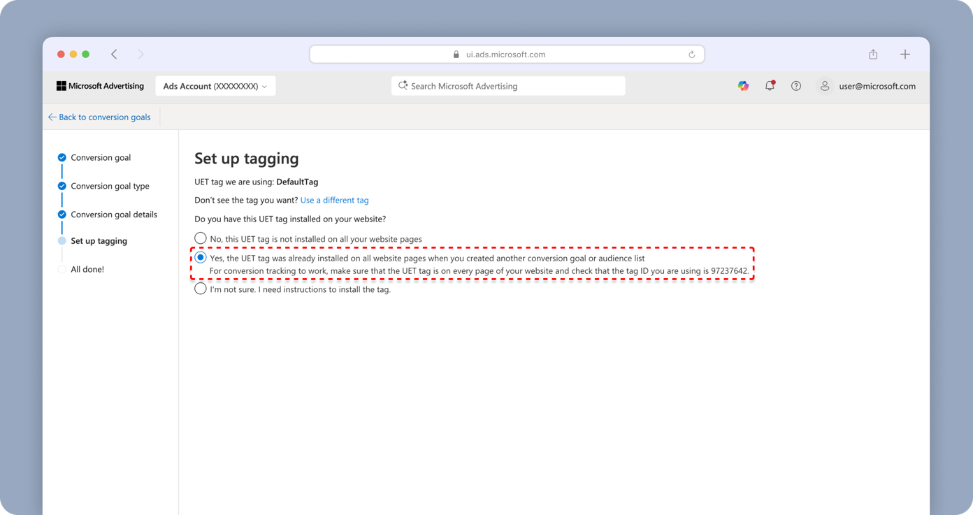 - On Set up tagging, select Yes, the UET tag was already installed on all website pages.