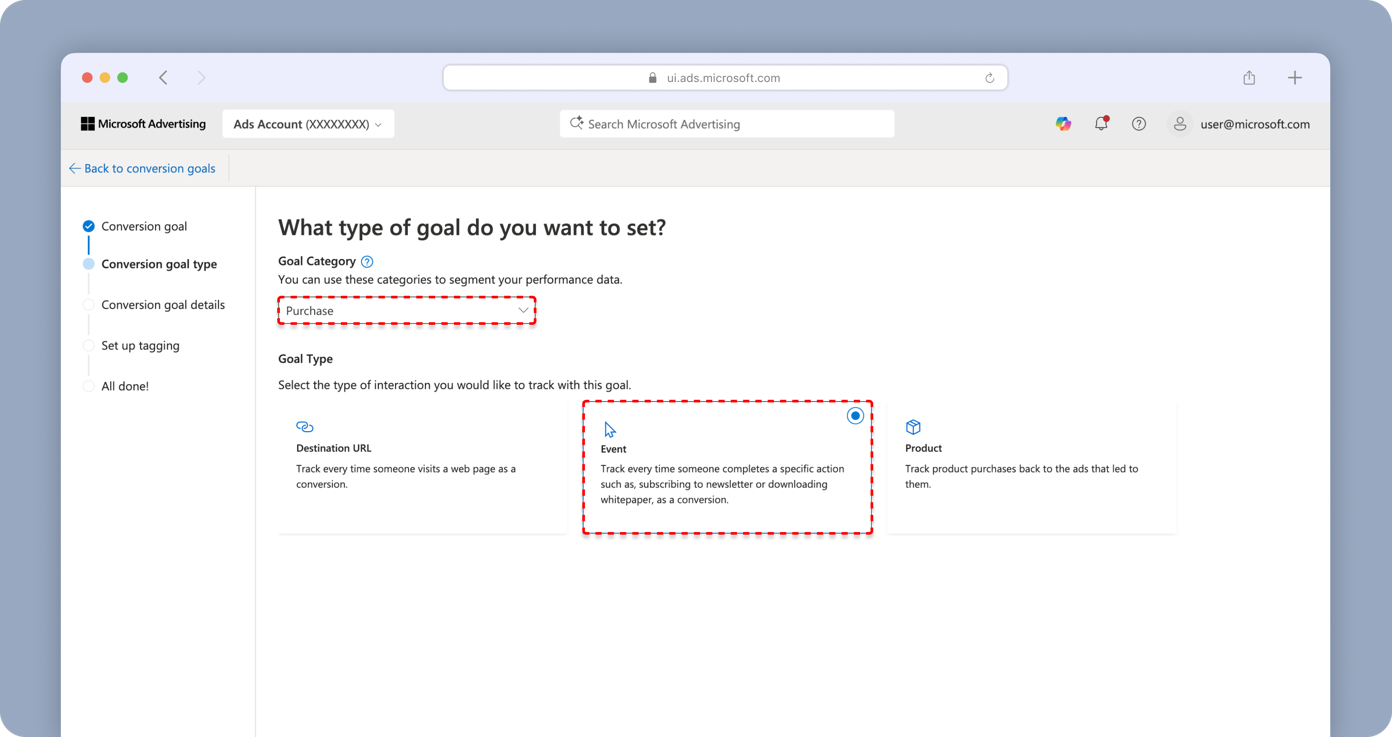 - Set Goal Category to Purchase.