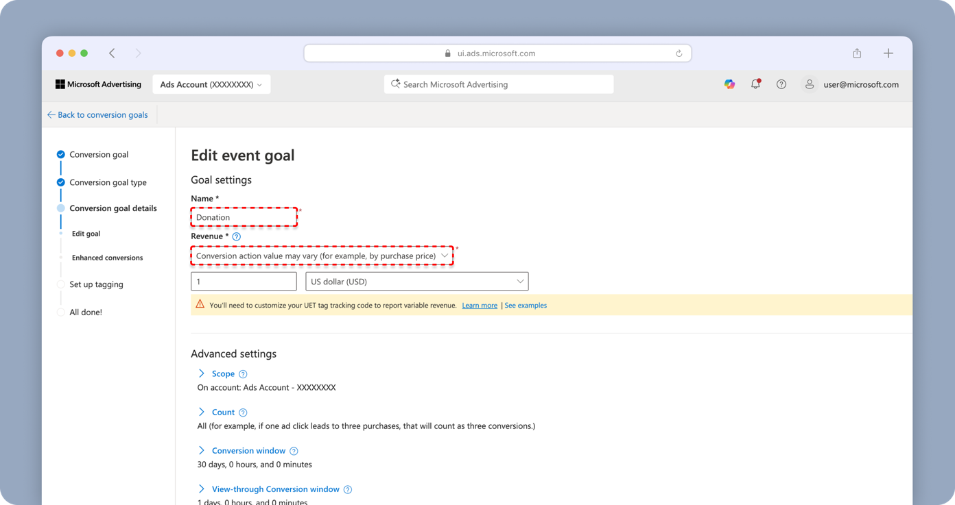 Create a Donation conversion goal in Microsoft Advertising