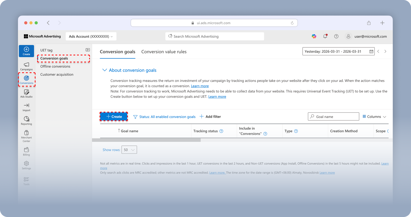 - In Microsoft Advertising, go to Conversions > Conversion goals.