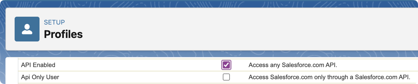 - API Enabled: This permission is crucial as the integration uses the API in multiple areas.