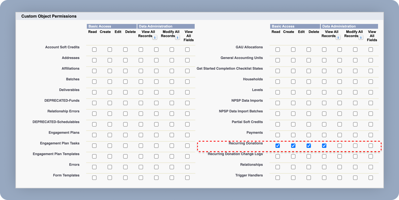 In addition to the permissions outlined above, Salesforce NPSP integration requires permissions for the "Recurring Donations" custom object. These are all required for the connect and sync processes: