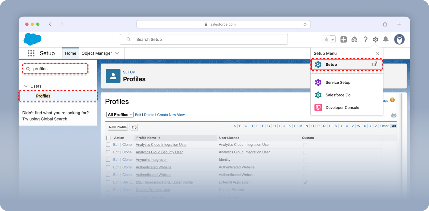 In Salesforce, go to Setup and use the Quick Find box to search for "Profiles". Configure permissions for the profile. This profile can be assigned to specific users later.