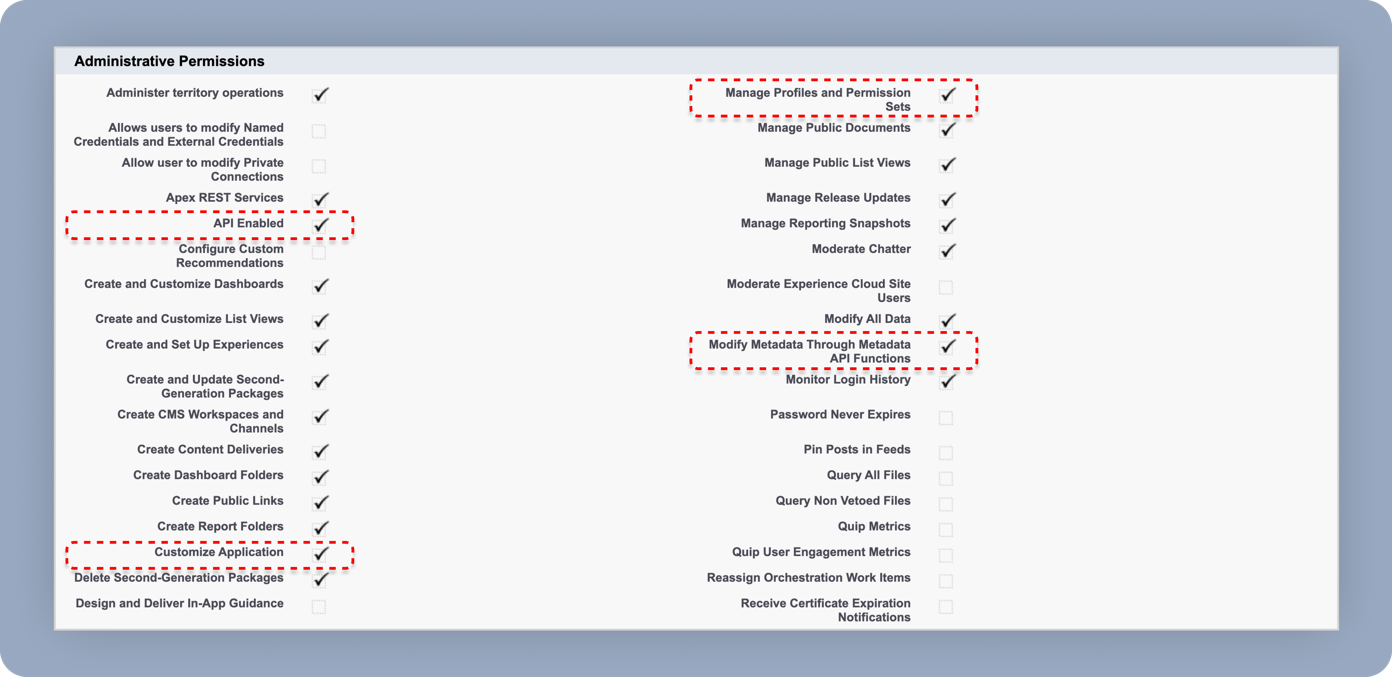 - Manage Profiles and Permission Sets: Essential for setting up the integration, including automatic profile permissions adjustments for new custom objects.