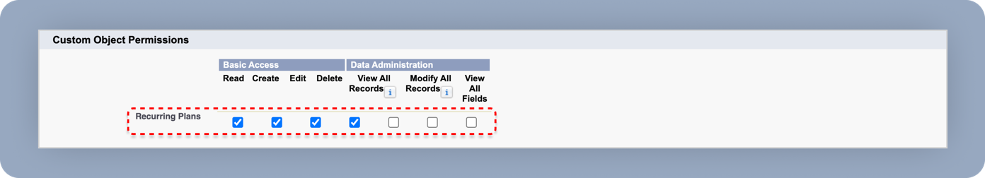 Ensure the following permissions are set for the "Recurring Plans" custom object, as they are essential for the sync process: