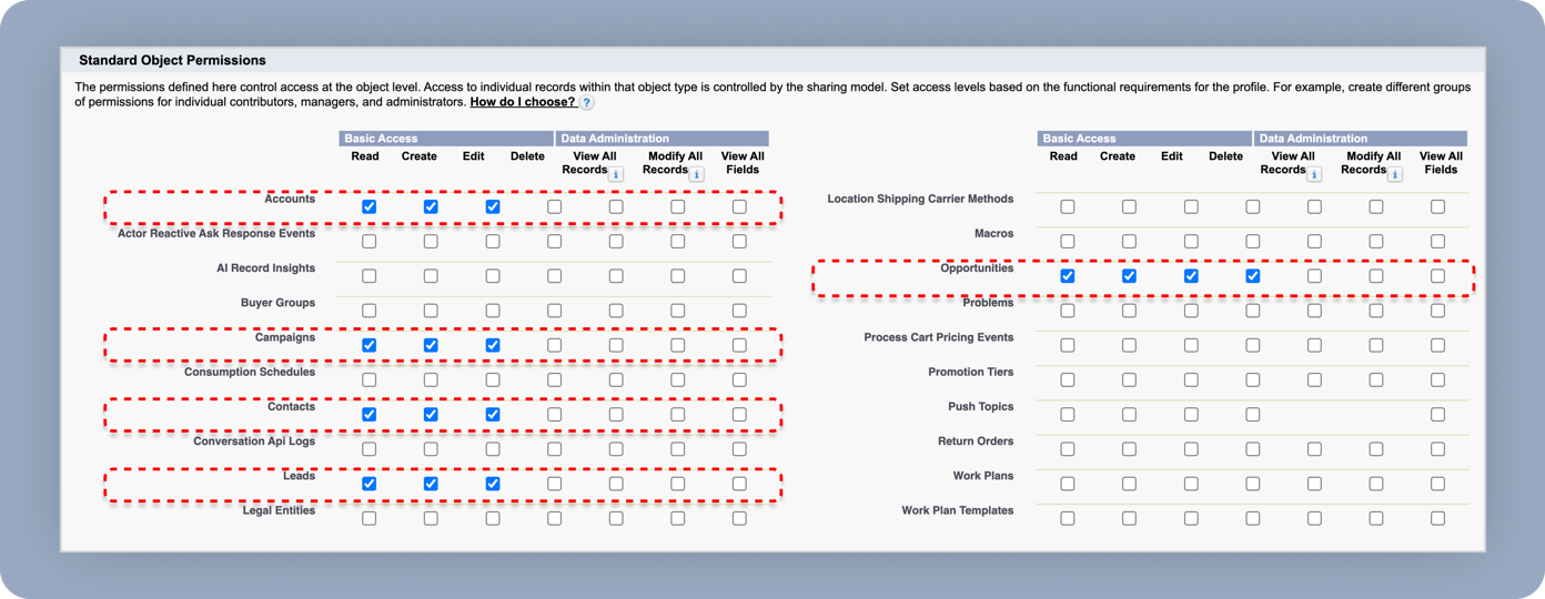 For Accounts, Campaigns, Contacts, Opportunities, and Leads, the following permissions are required: