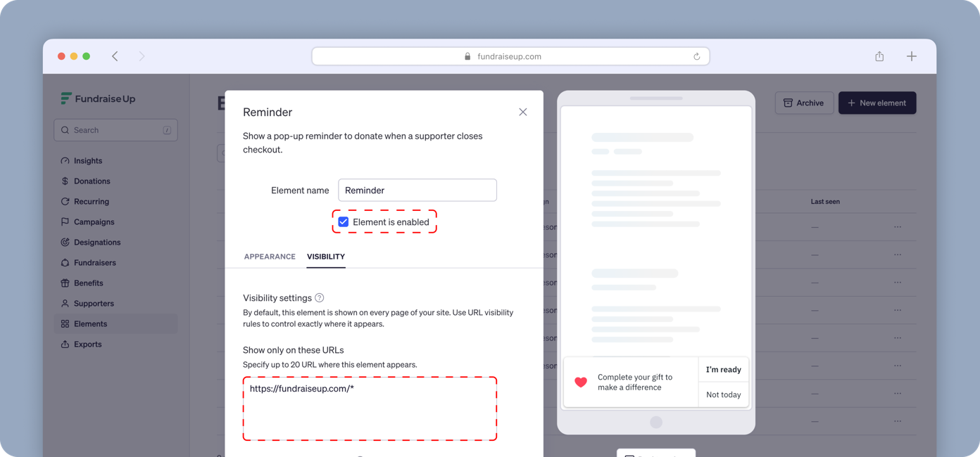 Fundraise Up’s global Elements, such as Floating Button, Sticky Button, Message Bar, Popup, Reminder, and Social Proof, are designed to maximize donation conversion and are enabled by default. These Elements do not require an embed code to appear on your website and can be managed entirely from your Fundraise Up Dashboard.
