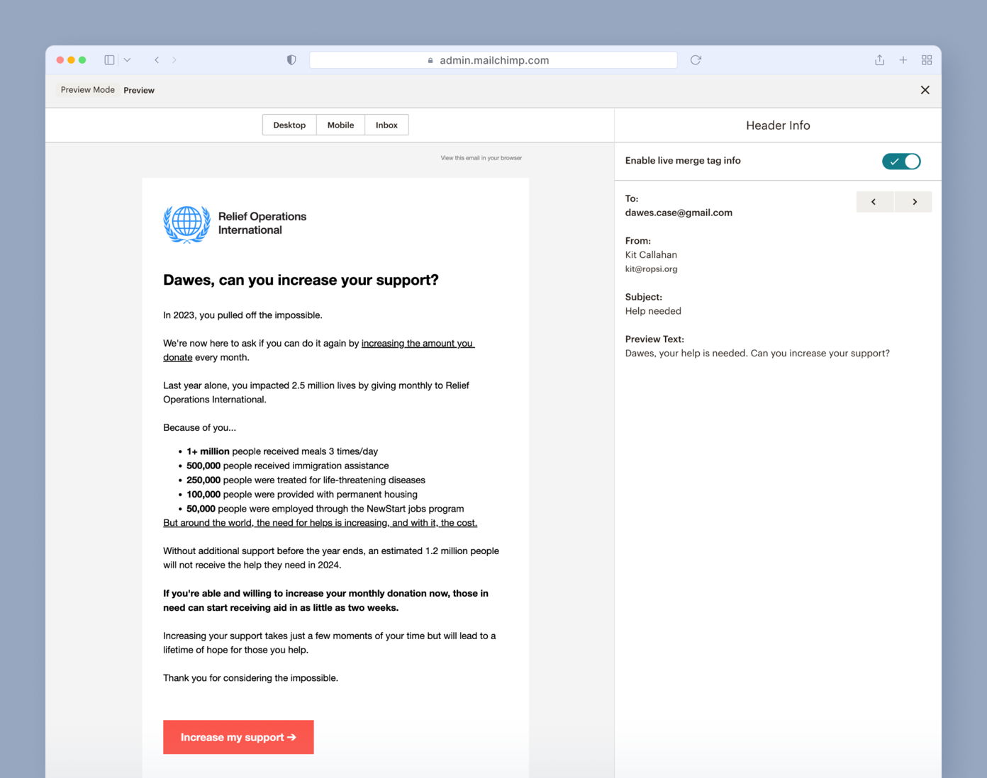 Integrating Upgrade Links into your email campaigns is a powerful way to engage and motivate your supporters. This article explains how to export information about your recurring supporters from the Dashboard and how to create contacts and Upgrade Links in Mailchimp.
