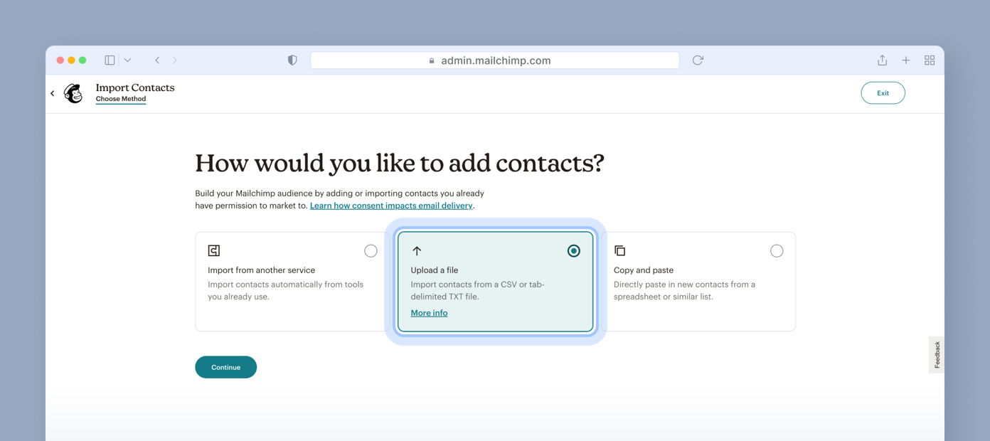 - Upload your CSV file and click Continue to organize. Mailchimp will prompt you to select the current audience and then optionally tag your contacts.