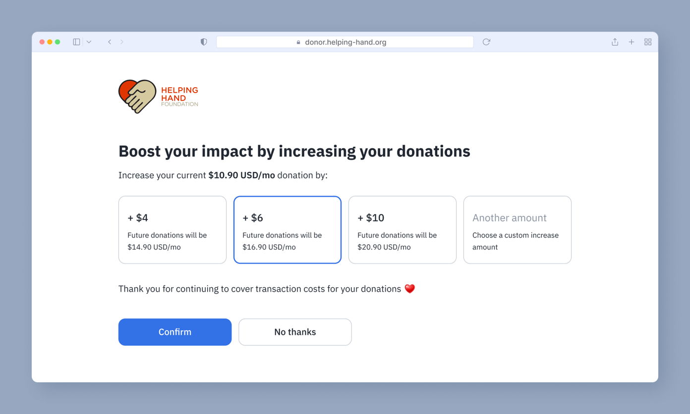 - You will be redirected to the donation Upgrade page. Each page is customized for each supporter, with AI-optimized donation amounts.
