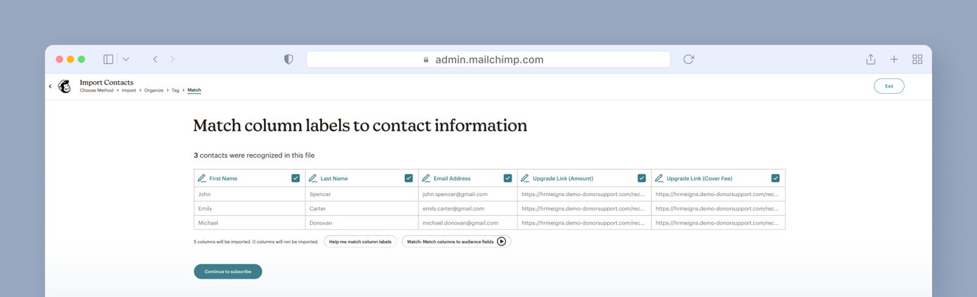 - When the Match column labels to contact information page loads, you may encounter errors, which is expected. Match the columns to the corresponding fields in Mailchimp:
