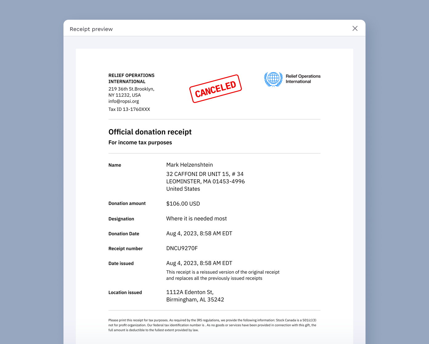 Once the donation has been refunded and the status of the donation has been updated to Refunded, the receipt will automatically obtain a Canceled sign. This indicates that the receipt has been voided and is no longer valid for tax purposes. You can verify the changes by downloading the updated version of the receipt from the donation record page. Once the refund has been made, a Canceled version of the original receipt will also be available for download through the Donor Portal by a supporter. Please be aware that the Canceled label will be translated based on the language preferences set in your Dashboard.
